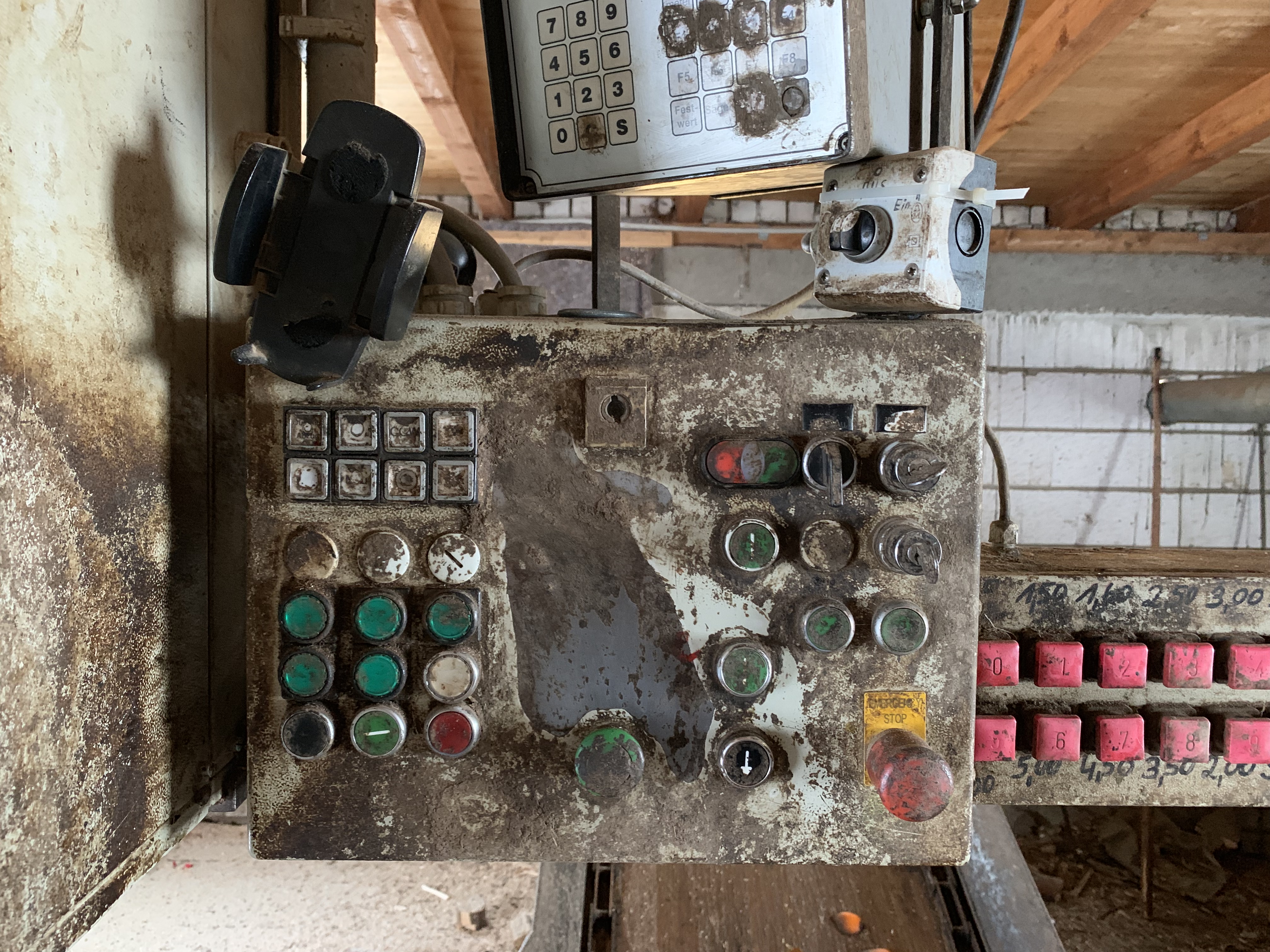 Moehringer cutting saw Transfer to conveyor belt. Dropping with pinball in boxes. Max. Cap length approx. 10 m. Schmitt Degenhardt Surveying with calculator and printer