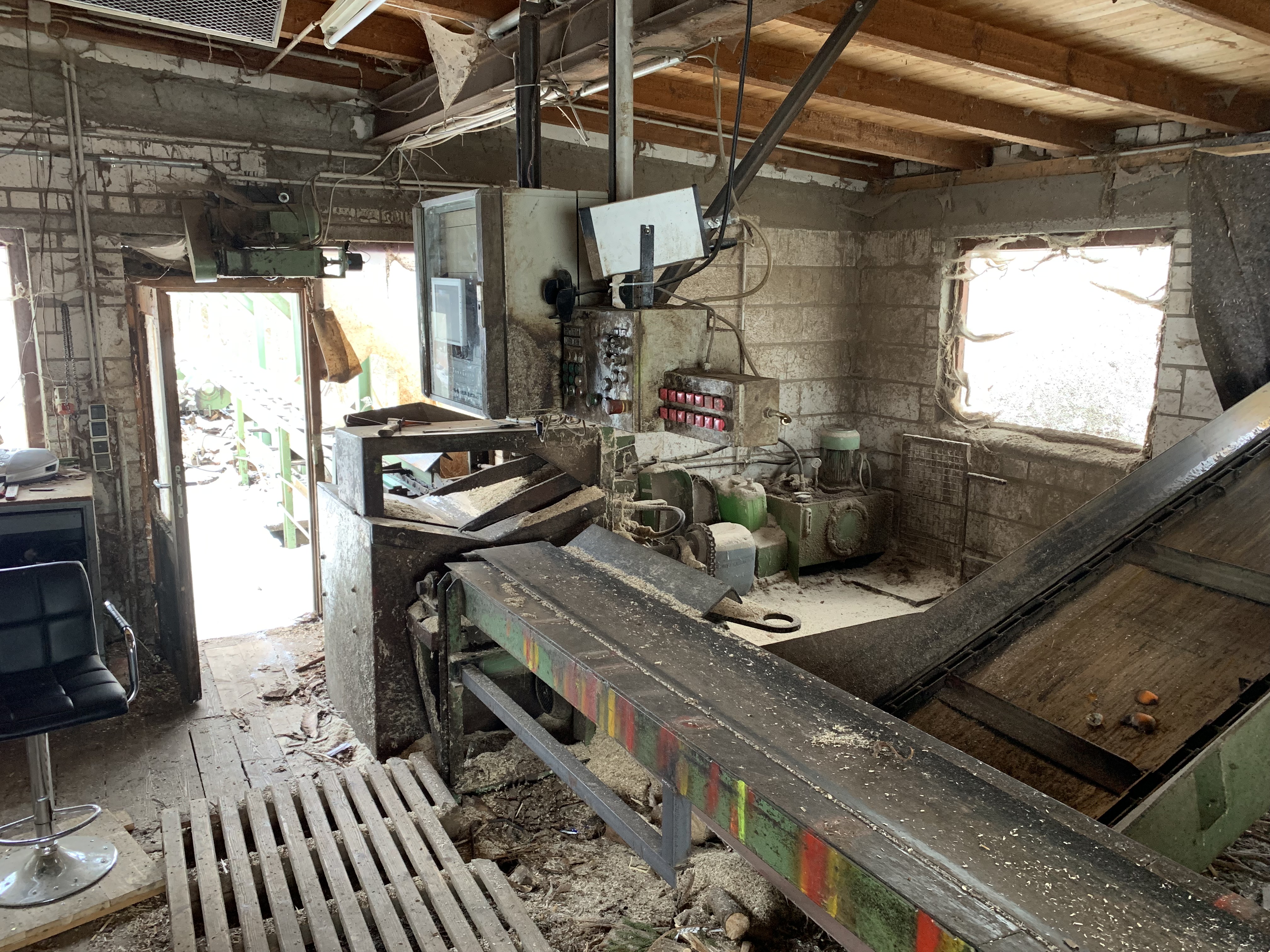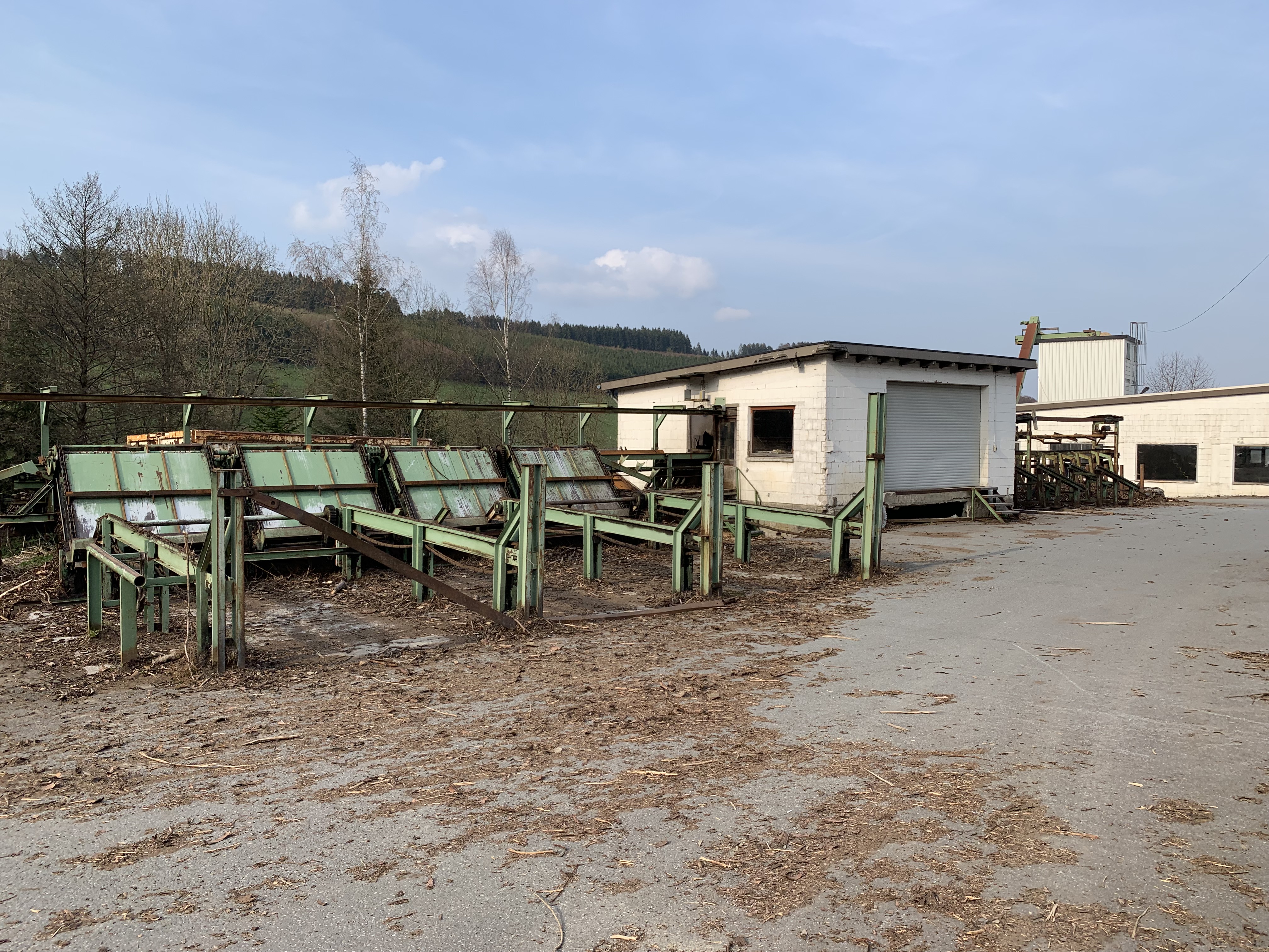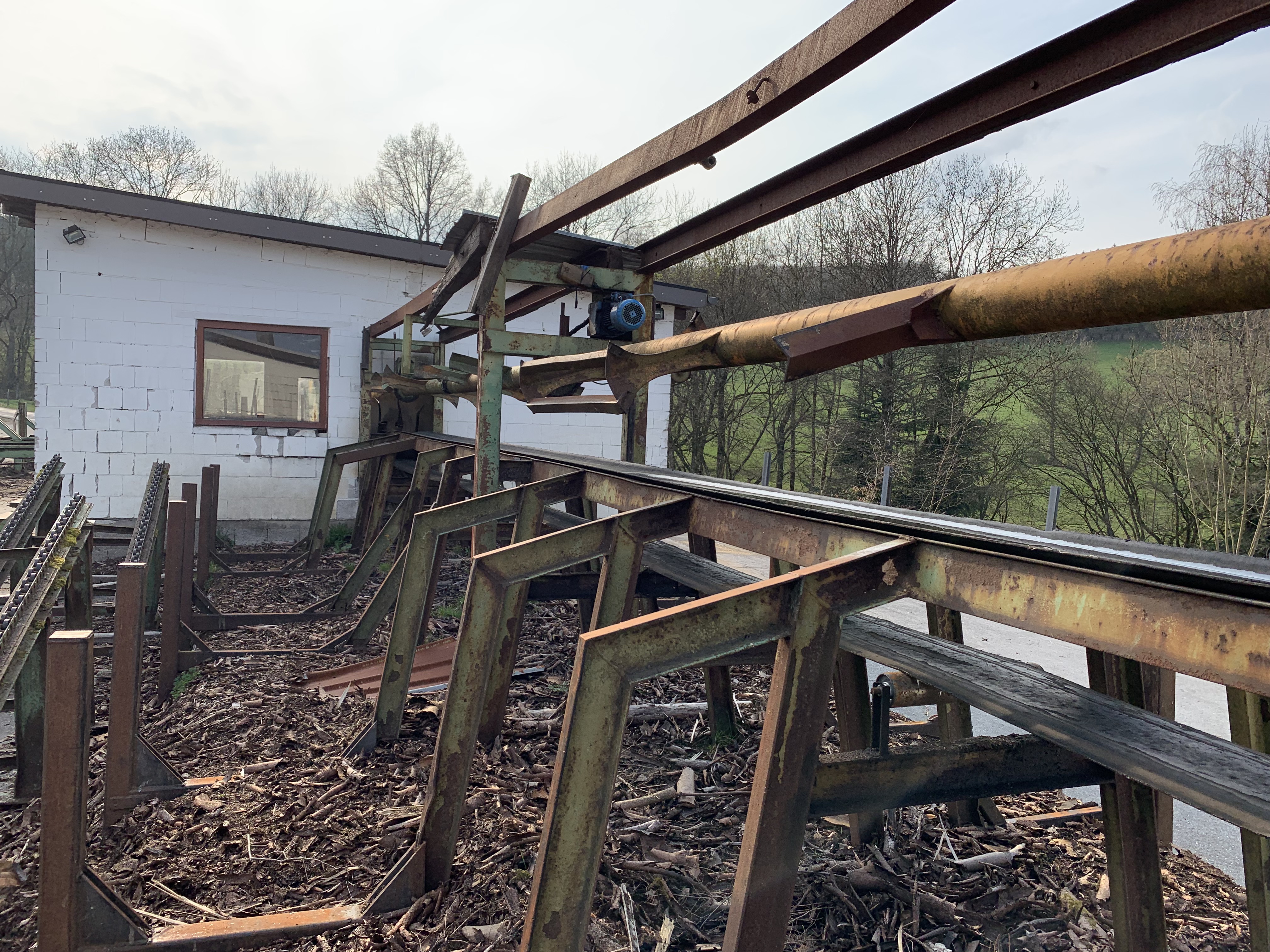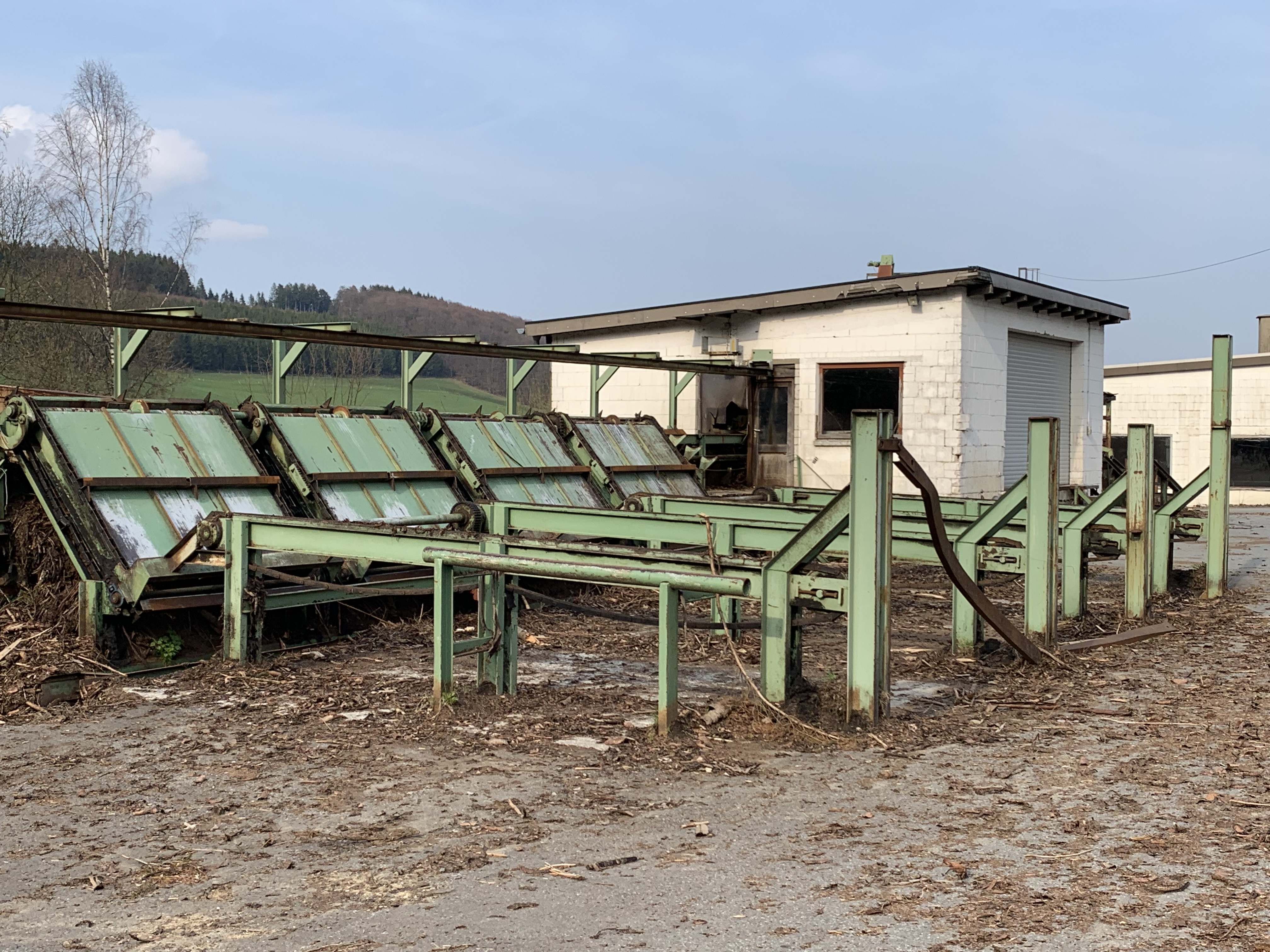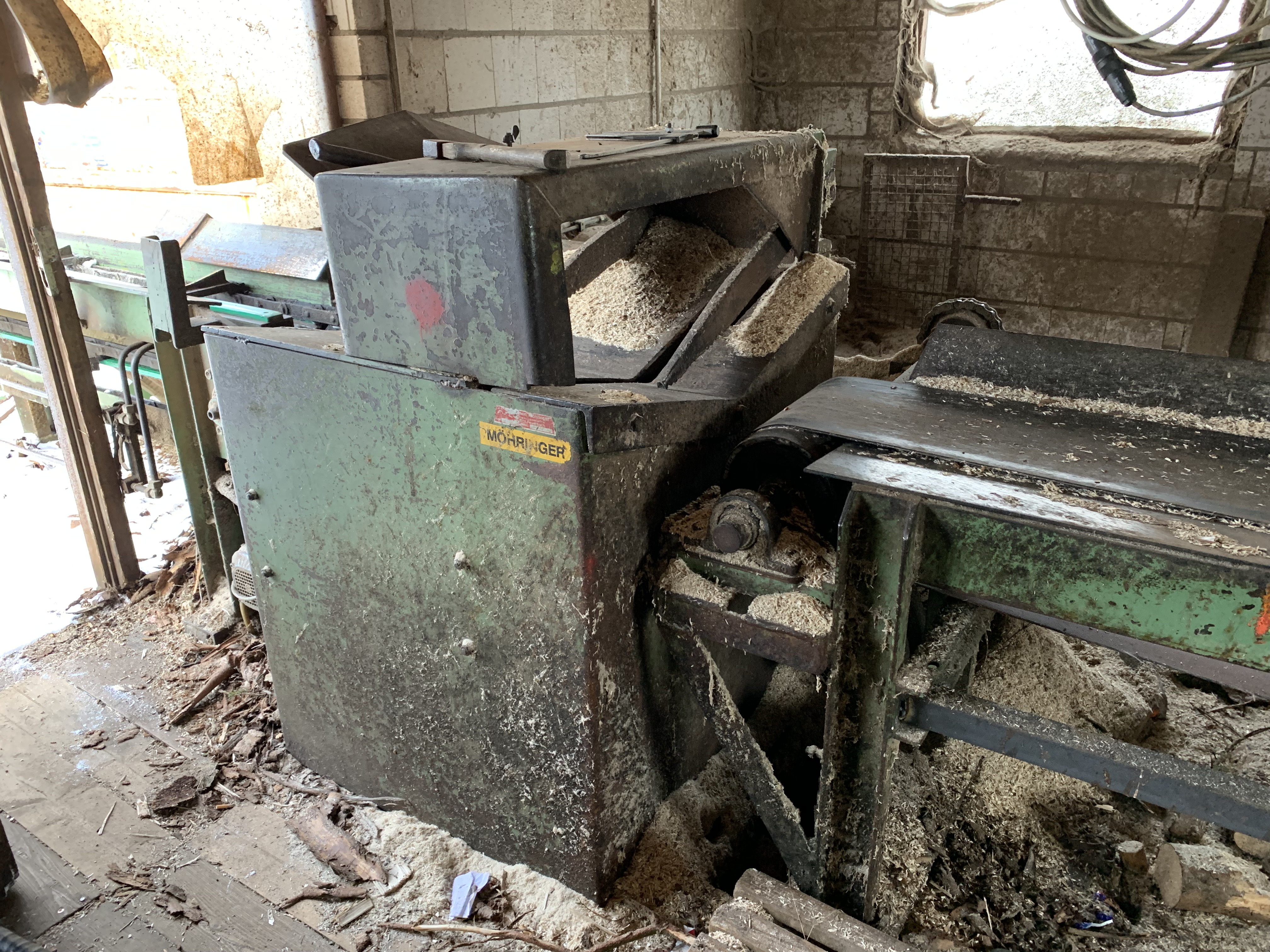 #Möhringer Kappsäge Übergabe auf Förderband. Abwurf mit Flipper in Boxen. Max. Kapplänge ca. 10 m. Schmitt Degenhardt Vermessung mit Rechner und Drucker