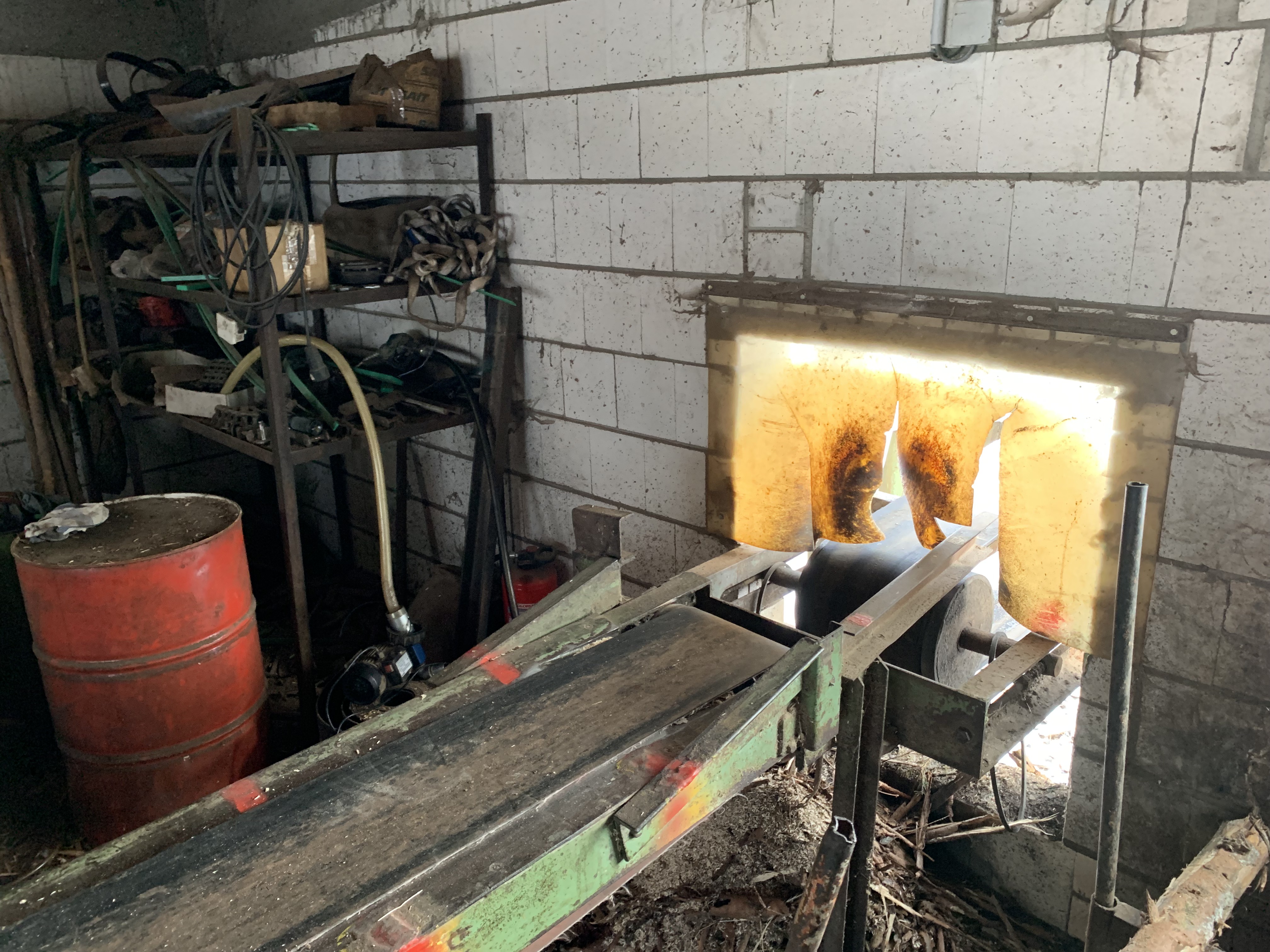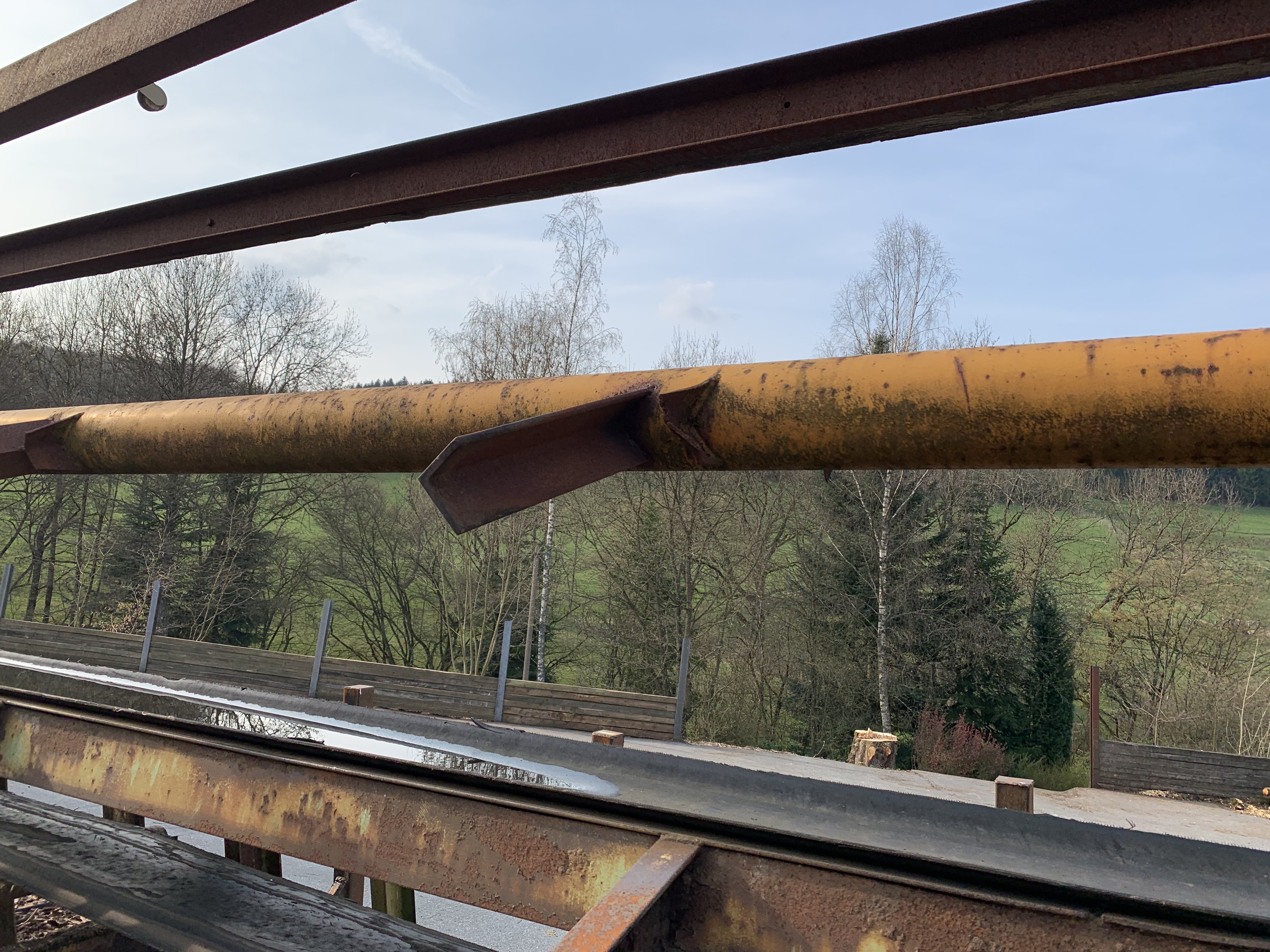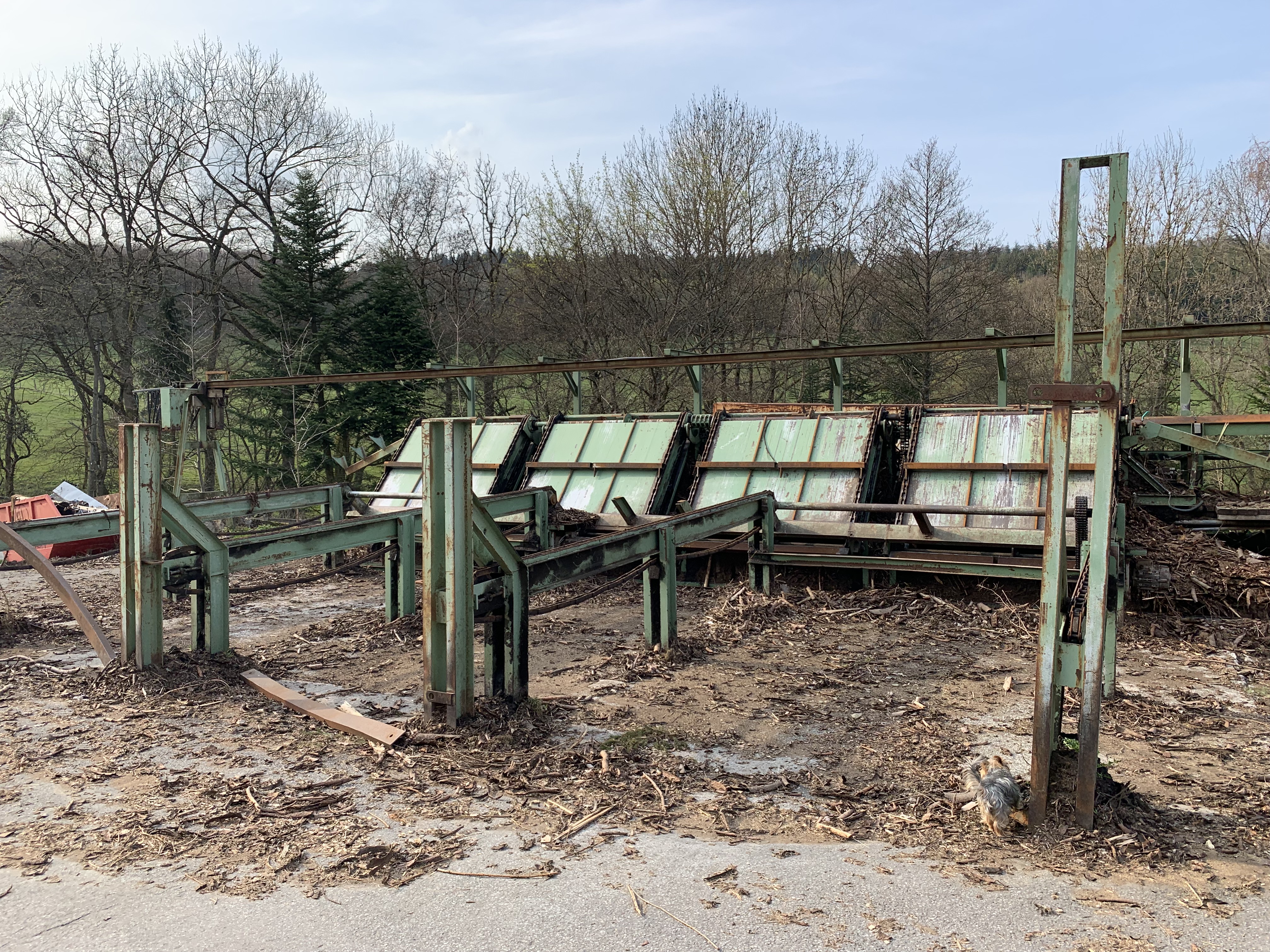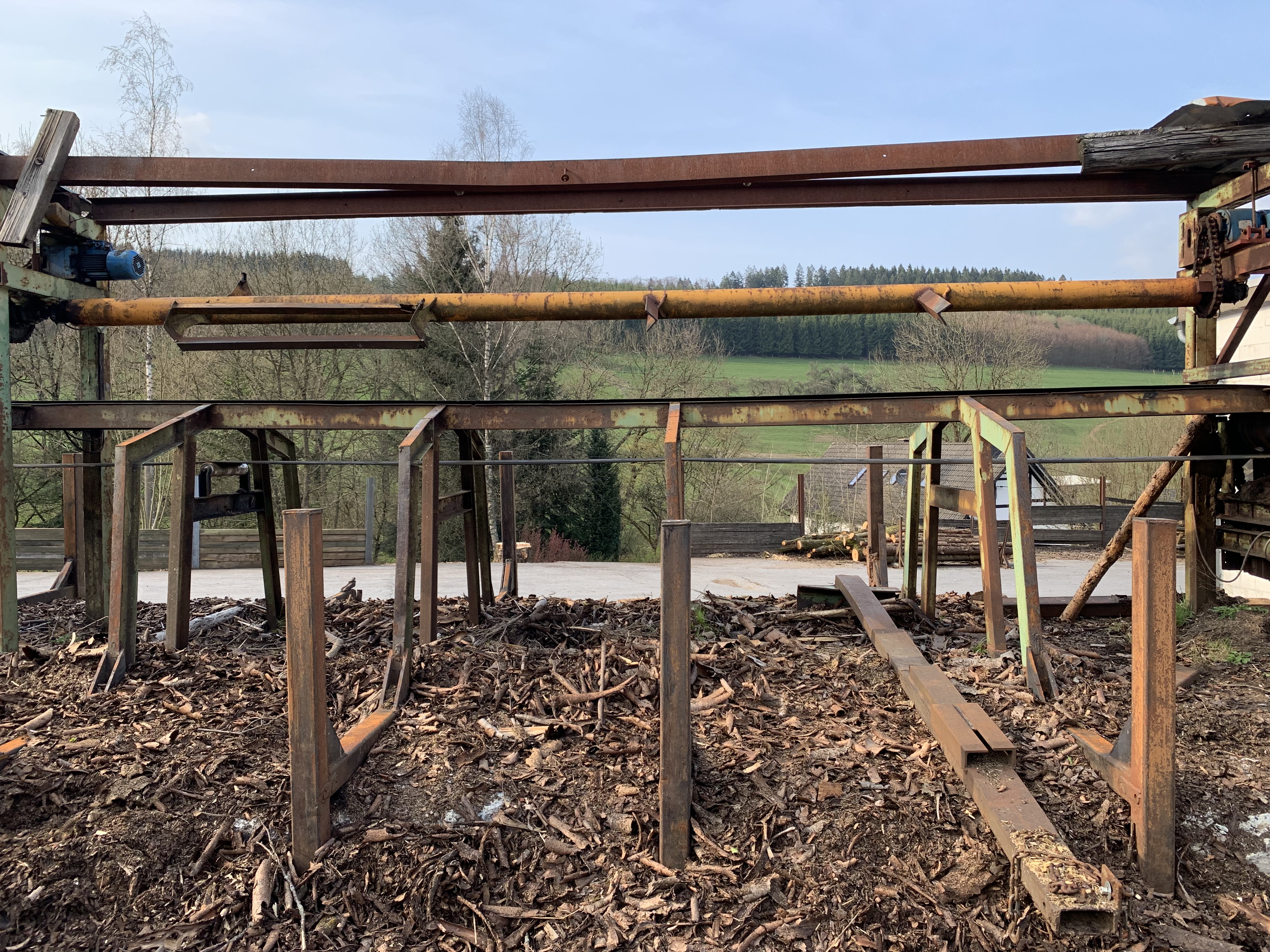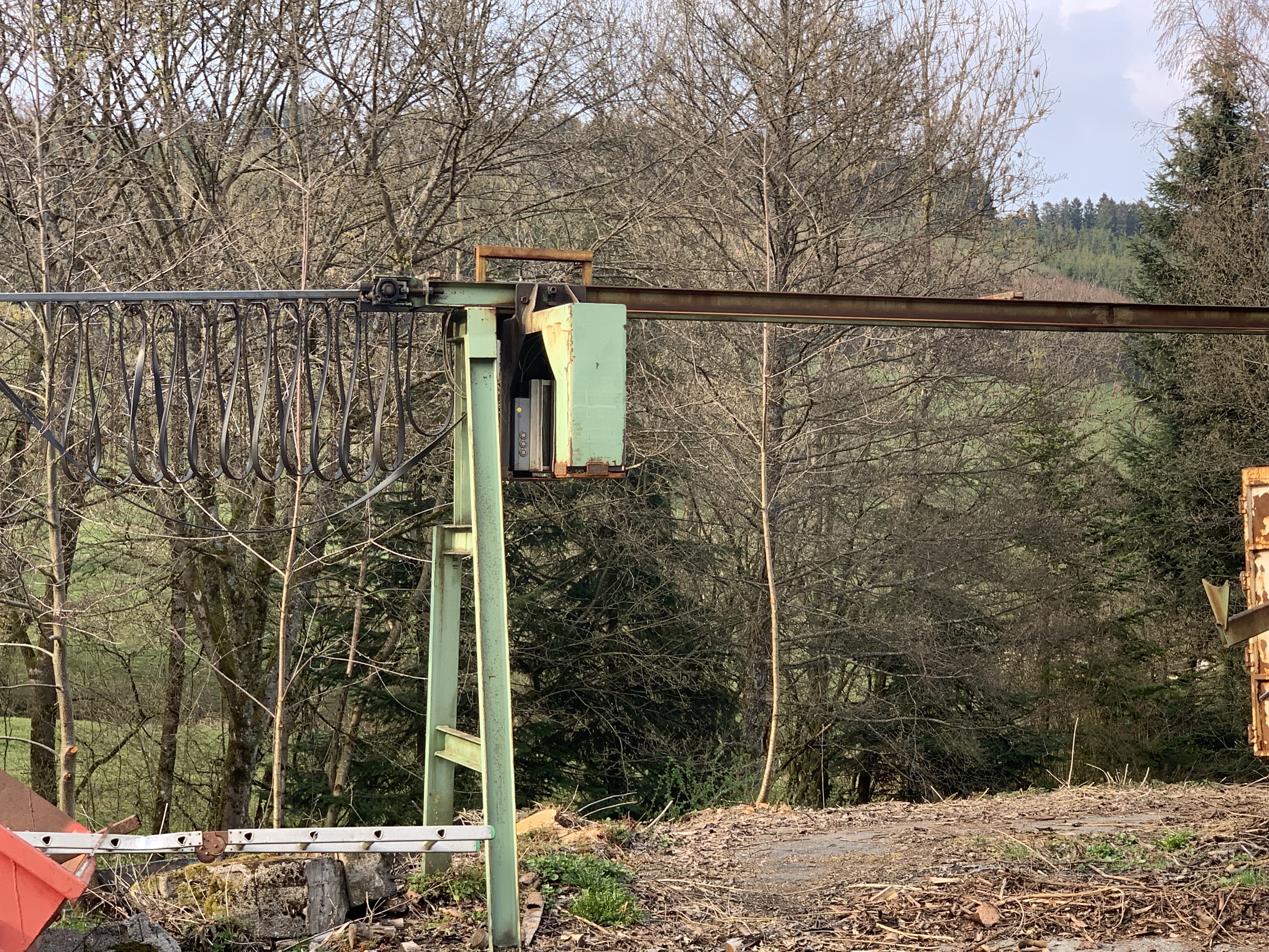 #Möhringer Kappsäge Übergabe auf Förderband. Abwurf mit Flipper in Boxen. Max. Kapplänge ca. 10 m. Schmitt Degenhardt Vermessung mit Rechner und Drucker