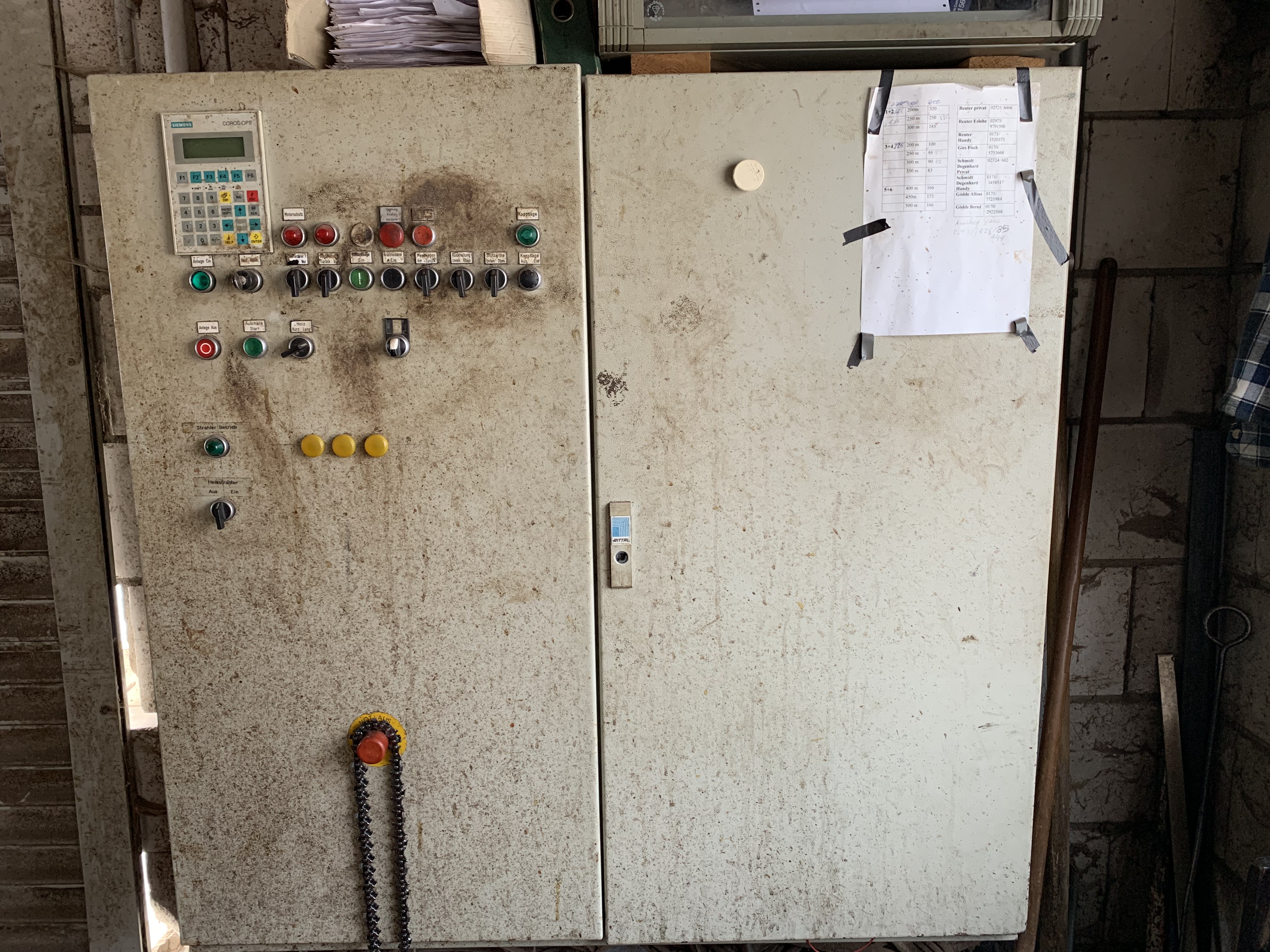 Moehringer cutting saw Transfer to conveyor belt. Dropping with pinball in boxes. Max. Cap length approx. 10 m. Schmitt Degenhardt Surveying with calculator and printer